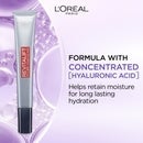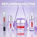 ![Image 1 - A silver tube of LOreal Paris Revitalift Filler [+Hyaluronic Acid] eye cream is shown on a purple and white background with abstract fluid shapes, accompanied by the text Targets Wrinkles, Replumps Under Eye Area. Image 2 - A silver tube of LOréal Revitalift Filler with [+Hyaluronic Acid] printed vertically on a red strip is displayed against a light purple bubbly background, alongside text that reads LORÉAL PARIS, FORMULA WITH CONCENTRATED [HYALURONIC ACID], Helps retain moisture for long lasting hydration. Image 3 - A woman with her eyes closed gently applies a product to her face with her finger, with small white dots of product visible on her forehead and under her eye, and the text Smooth Application and Apply Day and Night. Image 4 - Four LOréal Revitalift Filler products, consisting of an eye cream tube, an eye serum, a plumping water-cream jar, and a hyaluronic acid serum dropper bottle, are displayed on a reflective surface against a purple background with lab beakers, alongside text that reads REPLUMPING ROUTINE [HYALURONIC ACID], LORÉAL PARIS REVITALIFT FILLER [HYALURONIC ACID] EYE CREAM, LORÉAL PARIS REVITALIFT FILLER 2.5% [HYALURONIC ACID + CAFFEINE] EYE SERUM, LORÉAL PARIS REVITALIFT FILLER MICRO-EPIDERMIC HYALURONIC ACID PLUMPING WATER-CREAM, and LORÉAL PARIS REVITALIFT FILLER 1.5% HYALURONIC ACID SERUM.](https://s1.thcdn.com/design-assets/products/11223509/11223509/11223509-UK.webp)
