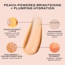 Infused with a blend of niacinamide, vitamin C, and real peach extract and juice, the silky elixir cushions the complexion with hydration while helping to brighten and smooth. Skin is left looking fresh, radiant and softly glazed. Lightweight and fluid, it melts in effortlessly, ideal for layering or worn alone for a natural, glowy finish.